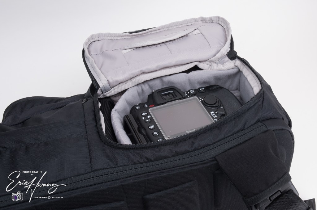 Unless you have a camera system very similar to what I’ll be carrying, this bag may not work for you. There are a very limited number of ways that the dividers in the padded camera compartment can be configured and still remain easily accessible from the side zippered opening.