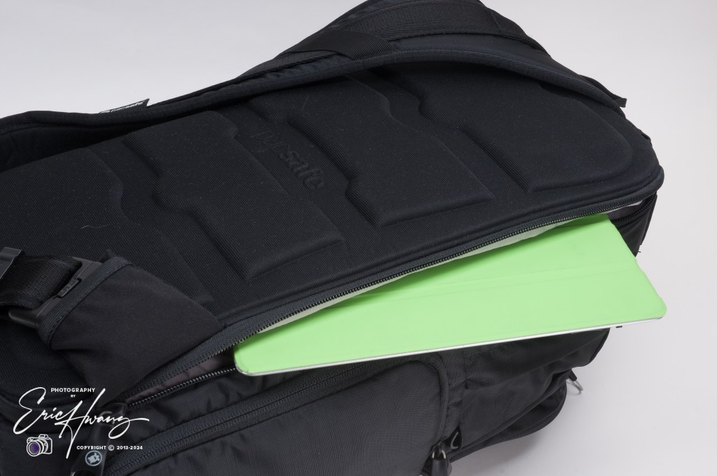 The bag’s security features are quite good. The front, sides, and bottom of the bag are lined with a stainless steel mesh to stop bag slashers. All of the outside zippers have recessed security clips that keep pickpockets from easily opening them. The nicely padded crossbody main strap goes from the top center of the pack to bottom right corner, when facing the back of the bag. There’s a secondary strap that comes up from the left bottom corner that snap buckles onto the main strap to help stabilize the bag. The main strap has padding with nylon tricot fabric on the inside face and has two stainless wires running through the strap to prevent it from being slashed. The main strap also has a buckle with a two button safety release that allows you to pass the strap around a fixed object to thwart opportunistic bag snatchers when you take it off to sit down.