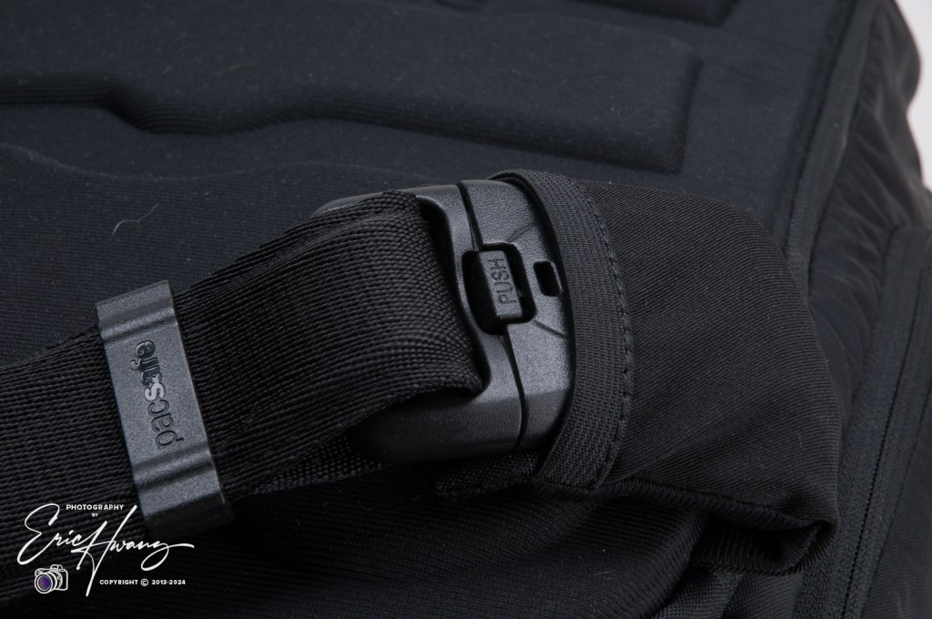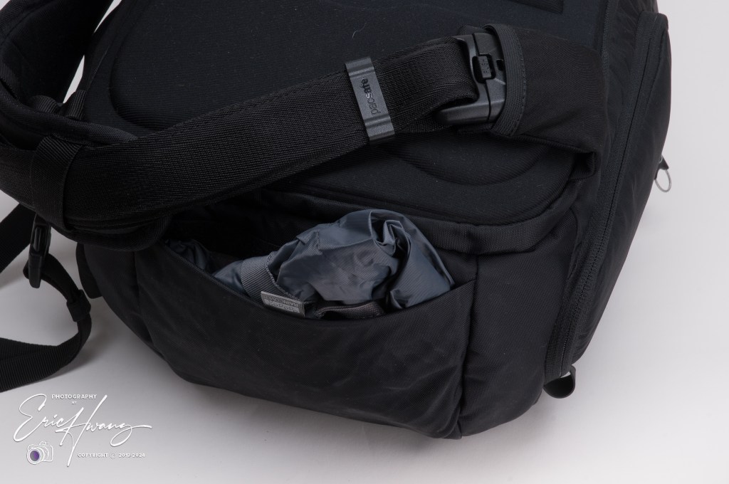 There isn’t much that I disliked about this bag; most were little things, but still worth mentioning. However, there is one thing that I consider a fatal flaw. The main strap has two wires embedded into the webbing to prevent slashing. The wire runs from the top of the bag across the padding against your body and wraps around the buckle near the bottom. However, the other side of the buckle is attached to the bottom of the bag with standard nylon webbing with no wires. The one place that you can’t easily see while wearing it, but is exposed to a slasher’s blade, is where it’s least protected. I consider that a fatal flaw. Also, the buckle with the two button safety release faces out where thieves can see it and study it before making their move. The safety release should be facing inward and more hidden. The rest of these issues are minor.