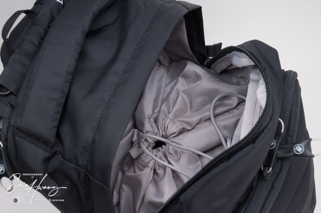 This camera bag has a 16 liter capacity and can hold a full-size DSLR with a mounted lens along with a second lens. It could also easily accommodate a mirrorless system with room to spare. Since I’ll be bringing a Nikon 18-300mm f/3.5-5.6 and a 12-24mm f/4 lenses, the size was perfect. This bag is geared for the more casual photographer and not a pro, so if you plan on bringing something larger and faster, such as 70-200mm f/2.8, you may have to reconfigure this bag, carry the big lens in a pouch in the main compartment of this bag, or simply find a different bag. The main compartment is divided mid-way by a drawstring closure, that can be opened up to make it one long compartment. The main compartment is big enough to also carry my large 100×150 filter bag with filter holder and adapter rings, as well as enough clothes and toiletries for a 2 -3 day excursion.