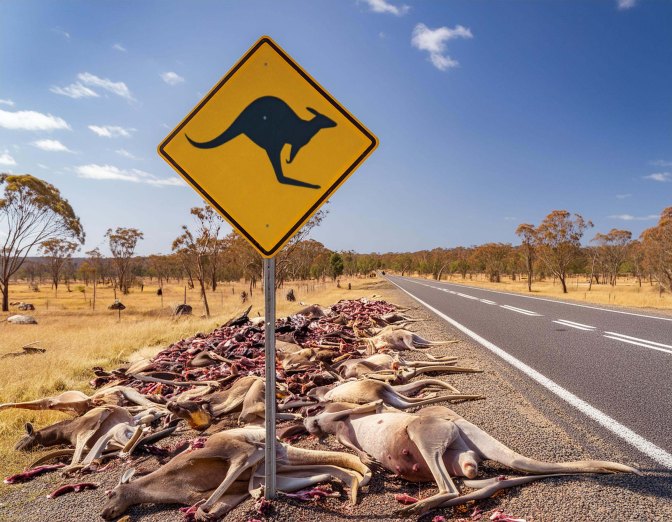 As if the road condition wasn’t bad enough, we also had to deal with animals with a death wish, both domestic and wildlife. Entire herds of cattle and mobs of kangaroos became additional dangers along the road.