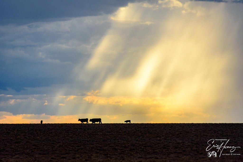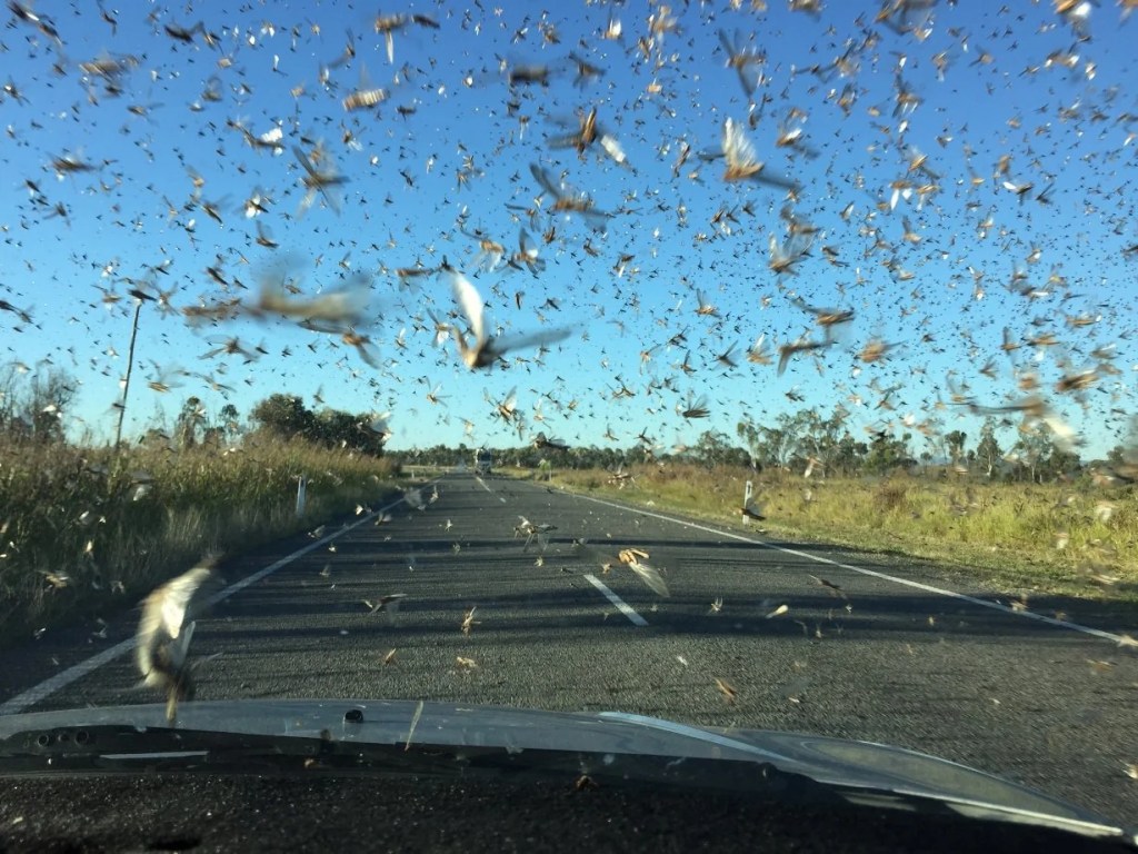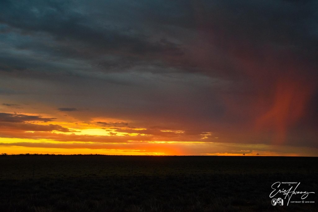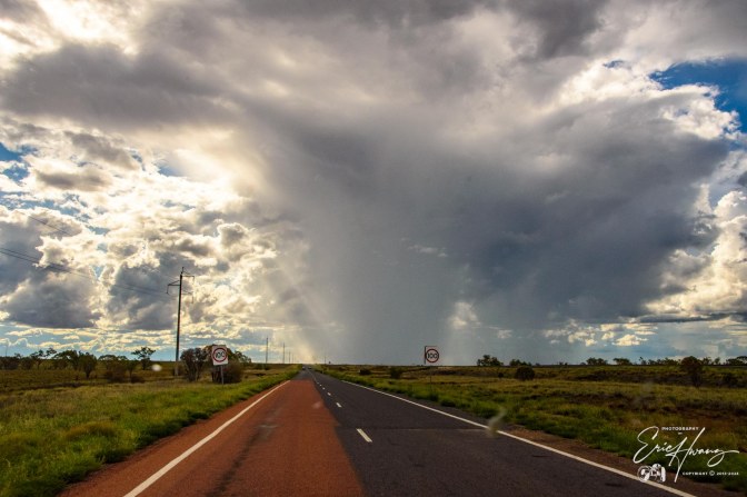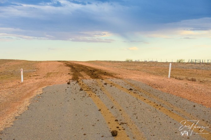 At this point, there were large grasshoppers in the road that jumped and hit our windshield, front and side of the car. It was but a harbinger of what was to come. Every few kilometers, the road would have a sealed floodway section that gave a short reprieve from the bumps and noise of the gravel. We began to see more kangaroos and fewer cattle. Rain clouds surrounded us and falling rain was apparent, but we weren’t rained upon. The sun descended in the western sky and colored the clouds like a series of John Constable paintings. Several times, I pulled over and took photos, but in that wide open space, the pictures just can’t capture the grandeur.