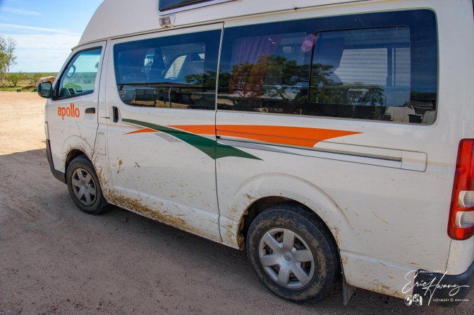 As we continued south, we encountered only one other vehicle. The rancher behind the wheel of the ute (utility vehicle, usually a Landcruiser) just gave us a puzzled look as we passed. Was he shaking his head? Probably, and only afterward can I even understand why. Not long after our encounter, the roads suddenly changed for the worse. That rain we didn’t encounter had obviously deluged this particular section of SR 19. The water and loose gravel became a slurry of mud that made the rear wheels of the van slip and fishtail like I was driving in mountainous snow and ice. The road—if you could still call it that—was somehow also deeply rutted. So much so that our van would bottom out frequently.