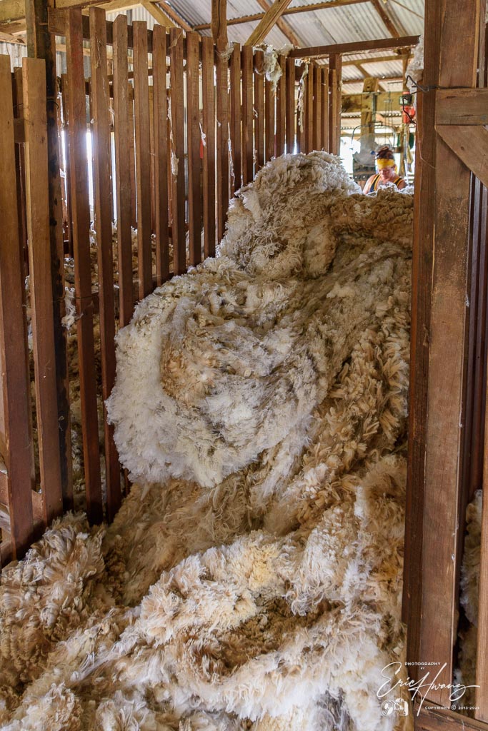 In addition to the shears, there are other people with various tasks. The roustabouts gather the shorn wool and sweep it off the ground, placing it on a table for the classers to sort the wool into different grades based on its length and quality. They place the different grades into separate bins. The presser takes the wool from each bin and puts it into a bundle using a machine that compresses the wool into a bag that eventually weighs up to 200 kilos (440 pounds). The filled bag is then marked with the grade of wool and where it’s from.
