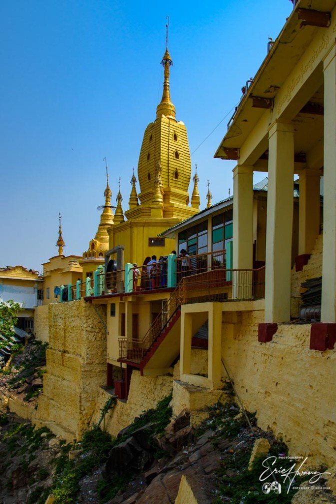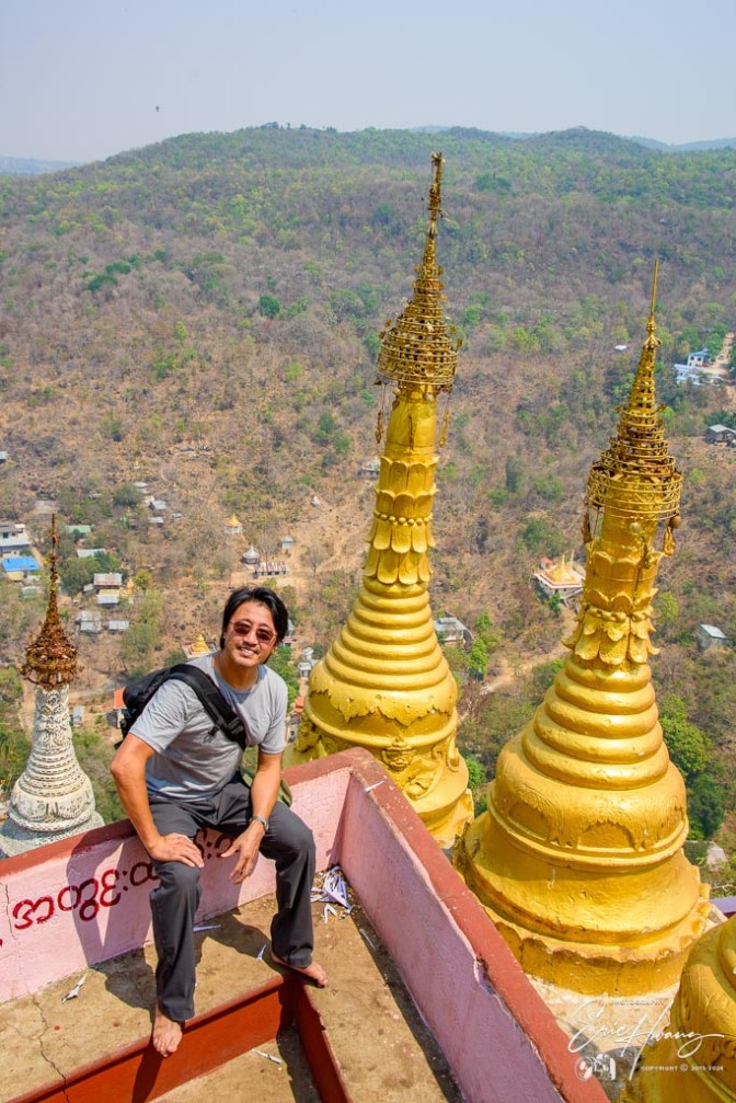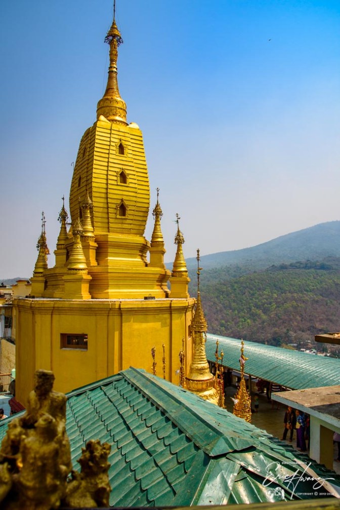 The road between Nyaung-U and Mt. Popa is a narrow, barely two-lane road, with dusty dirt shoulders, shared with everything from ox-carts to large tour buses. People and animals walk along the road and are often standing on the shoulder like kangaroos in the Outback. There doesn’t seem to be any posted speed limit. At 90-100 kph, the road was like a roller coaster ride as we lifted out of our seats quite often along the way. Nobody else was traveling this fast. I’m not sure why our driver had such a need for speed, but this meant he was passing everything on the road, even on hairpin turns up the mountains.