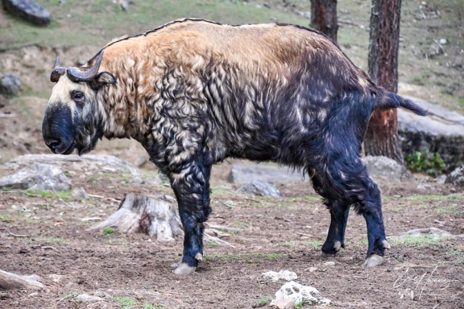 Takin are large cloven-hoofed animals closely related to mountain goats and musk ox. They are found only in the Eastern Himalayas from Bhutan and northeast India to the southwestern provinces of China. Bhutan Takin are the smallest of the four subspecies of Takin and number approximately 700 in the wild in Bhutan. Since they are migratory, getting an accurate count is difficult. Takin have a large snout that has been described like a “bee-stung moose,” with the coloration of a badger. Both male and female takin have horns and they secrete an oily, strong-smelling substance all over their body and use it to mark their territory.